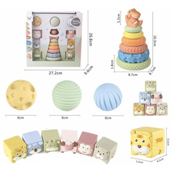 3 tipos de juguetes en 1 set: cubos, aros y pelotas.
