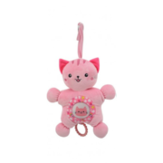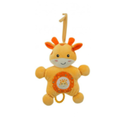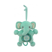 El cuerpo de peluche integra un sonajero que suena al moverlo, y un aro texturado que funciona como asa o mordillo, promoviendo agarre y causa-efecto durante el balanceo.