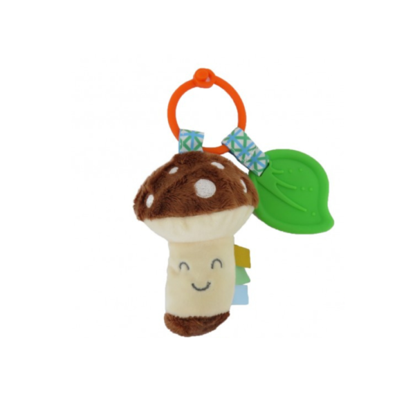 El peluche integra un cascabel interno que suena con el movimiento, mientras el clip permite fijarlo a barras y asas para evitar caídas; el mordillo ofrece alivio oral y punto de sujeción adicional.