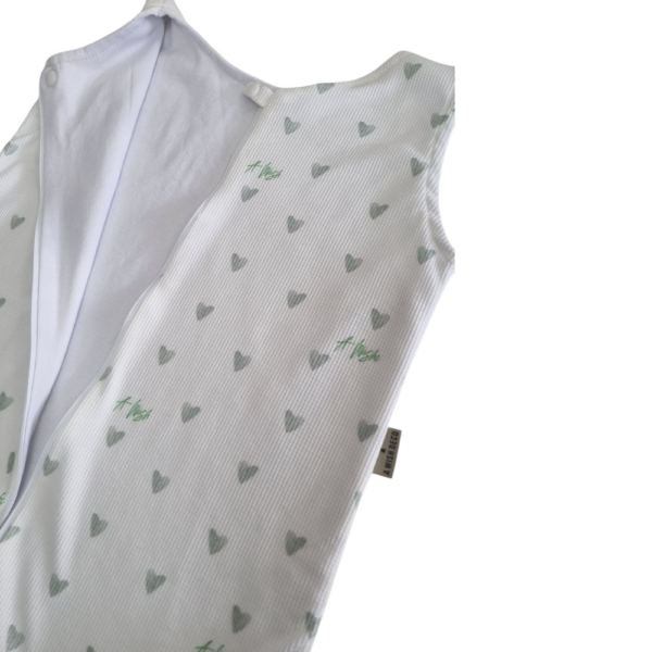 Wish Bolsa de Dormir Verano Micro Waffle es una saquito de dormir liviano pensado para reemplazar mantas sueltas y brindar abrigo seguro al bebé en noches templadas o de verano. Está confeccionada en tejido micro waffle suave y respirable, con diseño de corazones y forrería interior lisa, ideal para mantener una temperatura confortable sin sobrecalentar.