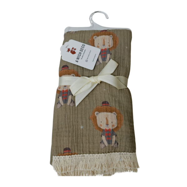 La Manta Doble Gasa con Flecos de A Wish Deco (Art. 1523) es una manta recibidora premium diseñada para arropar al bebé con la máxima delicadeza y estilo. Está confeccionada en tela de gasa doble (texturada y prelavada) de 100% algodón, un material natural, hipoalergénico y extremadamente respirable. Se presenta con estampados exclusivos y tiernos y cuenta con una terminación elegante de flecos de algodón crudo en sus extremos. Su presentación incluye una percha, cartón de marca y un moño de cinta rasada, ideal para regalo de nacimiento.