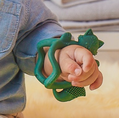 La silicona suave flexiona como pulsera adaptándose a la muñeca, con protuberancias que masajean encías al morder. Texturas diferenciadas estimulan sensaciones táctiles mientras calman dolor de dentición. Material: silicona pura de grado alimenticio. Apto para lavavajillas (rejilla superior) y esterilizador.