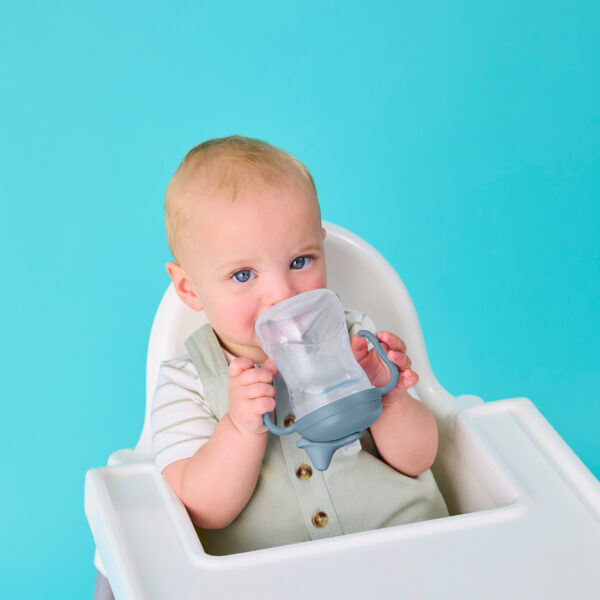 Boquilla de silicona suave que facilita la transición suave de mamadera a vaso, fomentando la independencia con asas ergonómicas.