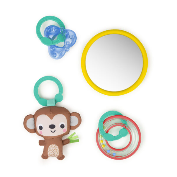 Barra con cuatro juguetes desmontables para adaptarse al desarrollo del bebé.