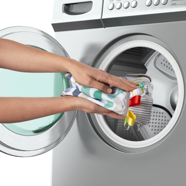 - El diseño con taggies (etiquetas táctiles) y colores vivos estimula los sentidos y el tacto.