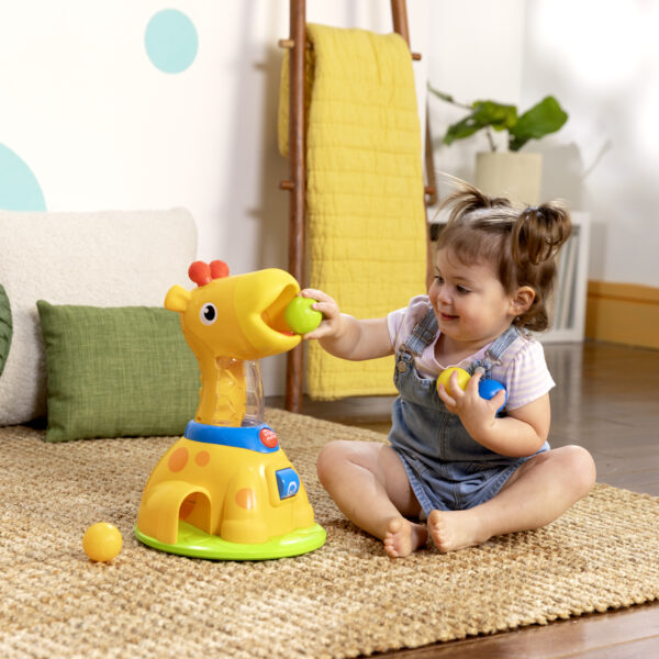 El Bright Starts HAB Spinnin Spots Giraffe Balls Play 17410 es un juguete interactivo para bebés recomendado desde los 6 hasta los 36 meses. Presenta una jirafa en la que los bebés pueden colocar bolas en su boca para luego verlas salir rodando por sus patas, lo que fomenta la motricidad gruesa y el aprendizaje de causa y efecto. El juguete incluye 5 bolas de colores brillantes.