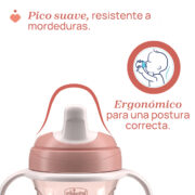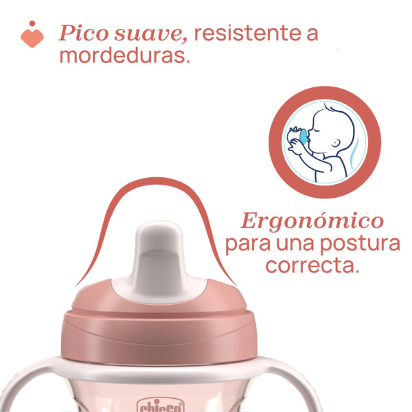 Pico ergonómico, semi suave, resistente a las mordidas. Boquilla con forma para facilitar una correcta colocación de los labios y descentralizada para promover una postura correcta del cuello mientras bebe.