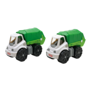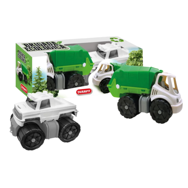El camión de reciclaje cuenta con compartimientos amplios para transportar objetos o materiales pequeños, mientras que la camioneta acompaña las tareas de carga y transporte. Ambos modelos ruedan fácilmente y permiten recrear diferentes escenarios de trabajo ecológico.