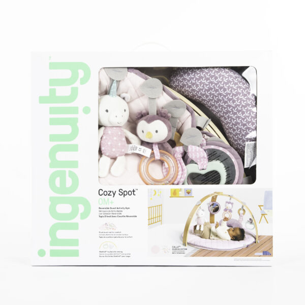 El Ingenuity Cozy Activity Gym Cala 12421 es un gimnasio de actividades tipo manta/playmat, apto desde recién nacido hasta 36 meses, con colchoneta ultra mullida reversible, arcos de madera natural y juguetes sensoriales desmontables para estimular el desarrollo del bebé.