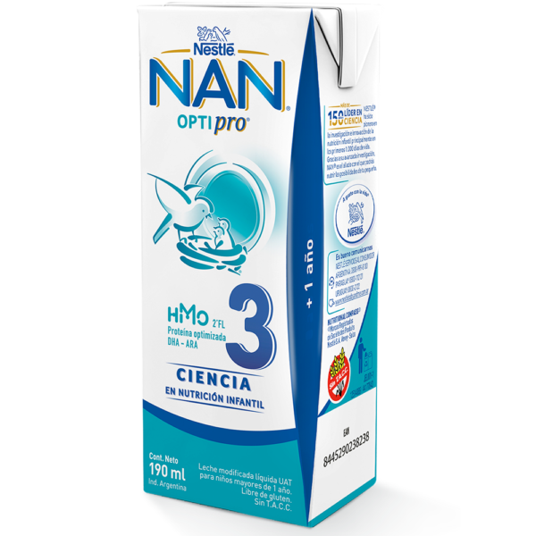 NAN® OptiPro® 3 (+ 1 año). Contiene HMO un oligosacárido, Optipro® proteína optimizada en cantidad y calidad y DHA-ARA, ácidos grasos esenciales. Sin TACC.