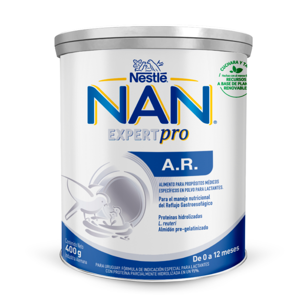 NAN A.R. Tarro x 400 g es una fórmula infantil de inicio para lactantes con reflujo o regurgitación. Contiene proteína parcialmente hidrolizada, L. reuteri y almidón pre-gelatinizado.