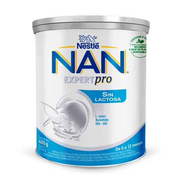 NAN® Sin Lactosa Fórmula láctea en polvo para lactantes de inicio. Con Cultivos Vivos: L. Reuteris y con DHA-ARA. Trae cuchara medidora.