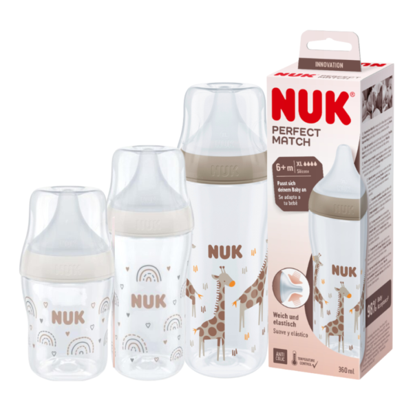El Set 3 Mamaderas Perfect Match (150-260-360 ml flujo XL) es un kit de mamaderas que reúne tres capacidades para acompañar el crecimiento del bebé: 150 ml, 260 ml y 360 ml, todos con tetina de silicona Perfect Match de flujo rápido pensada para bebés mayores (aprox. +6 meses) y tomas más abundantes. Las mamaderas incluyen el indicador de Control de Temperatura patentado por Nuk, que cambia de color cuando el contenido está demasiado caliente, y son libres de BPA.