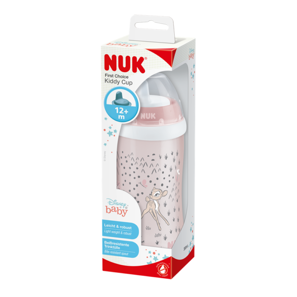 Nuk Kiddy Cup 300ml Bambi es un vaso resistente diseñado para niños a partir de los 12 meses, ideal para la etapa en la que empiezan a usar sus dientes. Su cuerpo es de polipropileno (PP) ligero y robusto, con un delicado diseño en tonos rosa pastel que presenta a Bambi, el icónico personaje de Disney, rodeado de motivos naturales. A diferencia de otros vasos, incorpora una boquilla rígida diseñada específicamente para soportar mordiscos, combinando durabilidad con un sistema antiderrame.