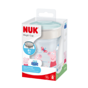 Nuk Vaso Magic Cup Peppa Pig es un vaso de aprendizaje de 230 ml pensado para bebés desde +8 meses. Está diseñado para que puedan beber desde cualquier lado del borde, con un sistema de sellado antiderrame de silicona que evita fugas y facilita la transición del biberón al vaso.