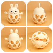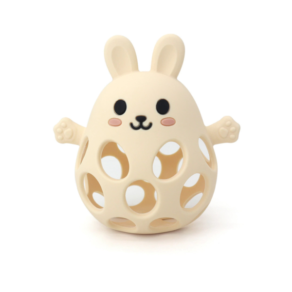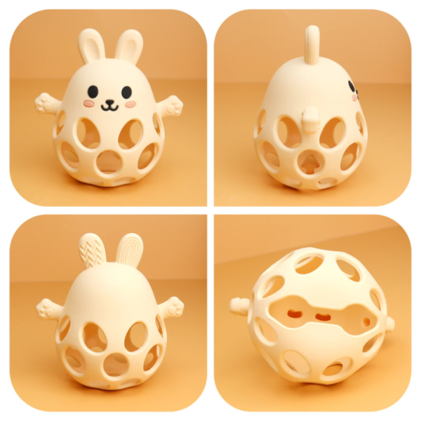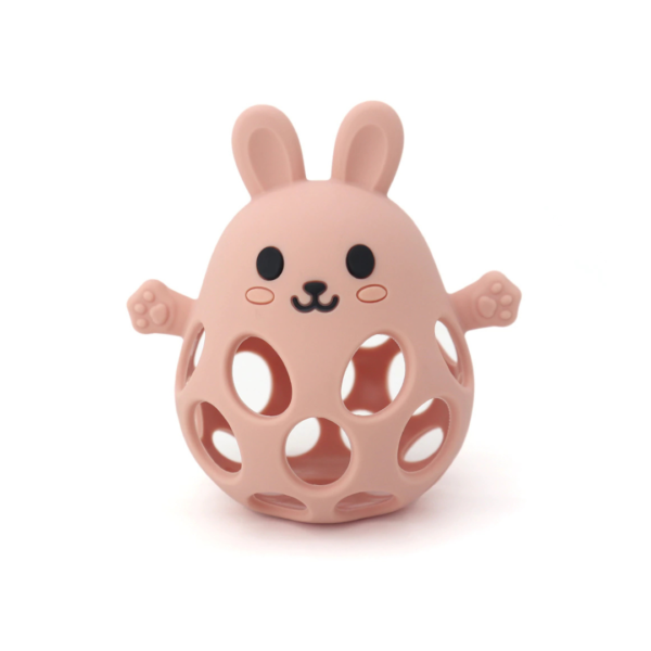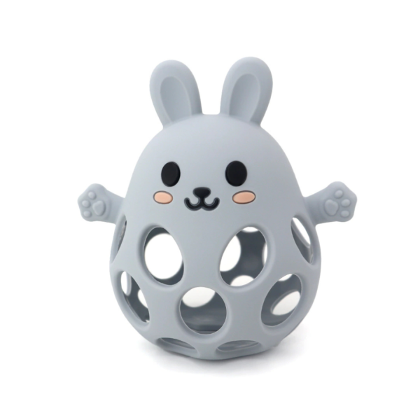 Diseño 2 en 1: mordillo y pelota sensorial con forma de conejo.