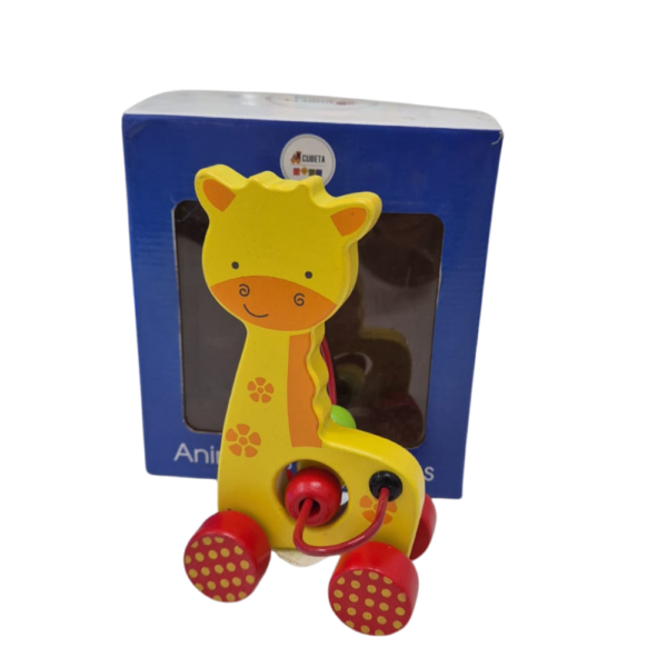 Es un juguete didáctico de arrastre y motricidad fina, diseñado especialmente para bebés y niños pequeños (recomendado a partir de los 12 o 18 meses). Está fabricado íntegramente en madera pintada con colores vivos y seguros. Su diseño principal es la figura plana de una simpática jirafa amarilla con manchas anaranjadas, montada sobre cuatro ruedas rojas con lunares que le permiten desplazarse.