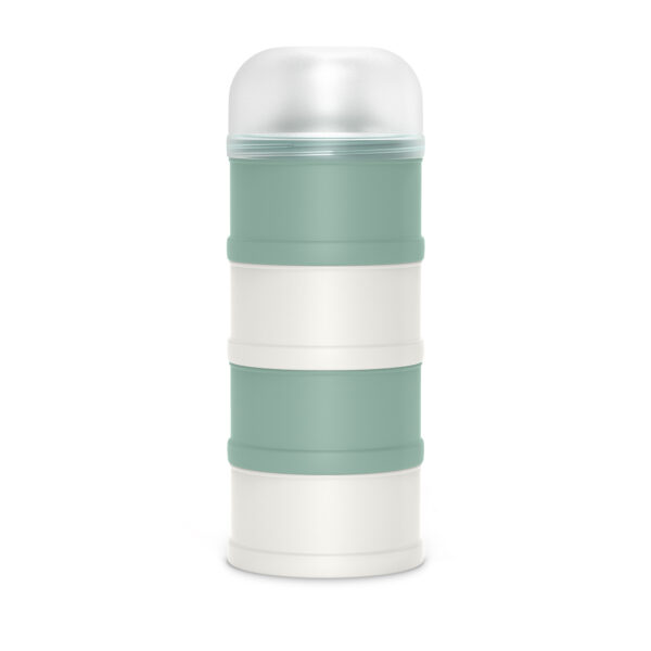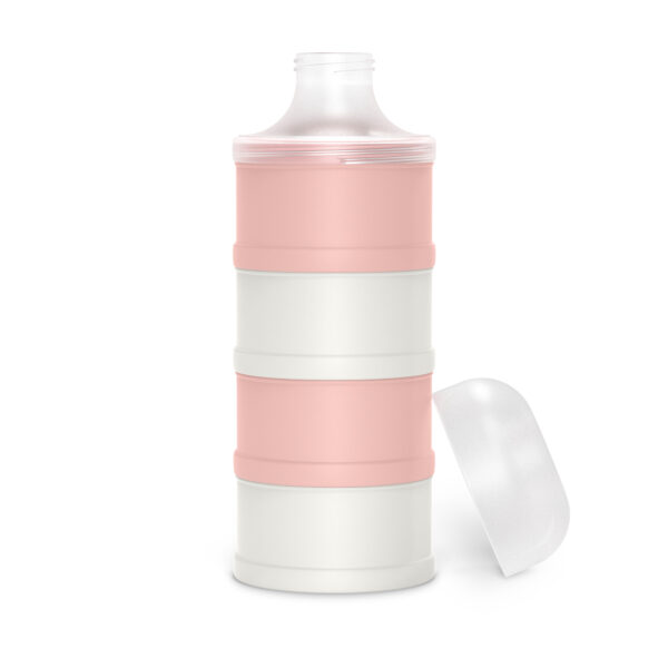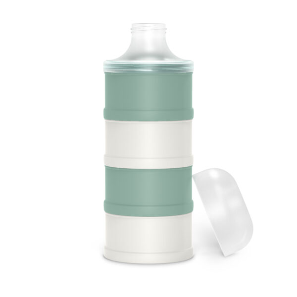 Los compartimentos se apilan uno sobre otro y se fijan mediante cierre de rosca entre sí y con la tapa con boquilla, asegurando que ninguno se abra accidentalmente dentro de la pañalera. Para usarlo, se separa el compartimento con la dosis deseada, se le coloca la tapa con boquilla y se vierte directamente en la mamadera.