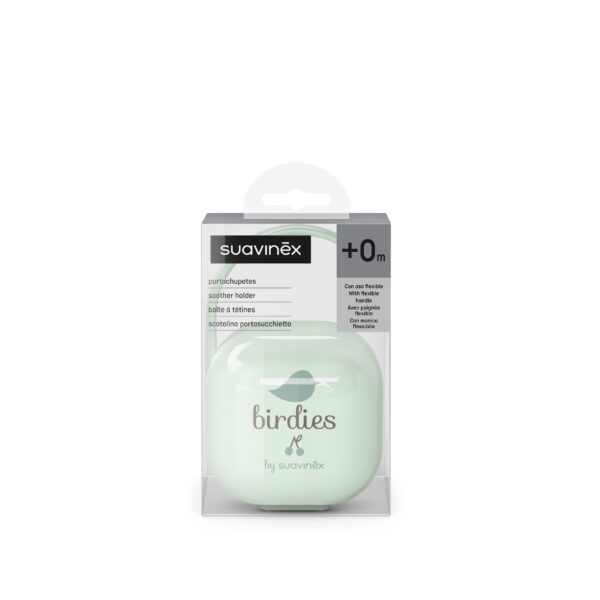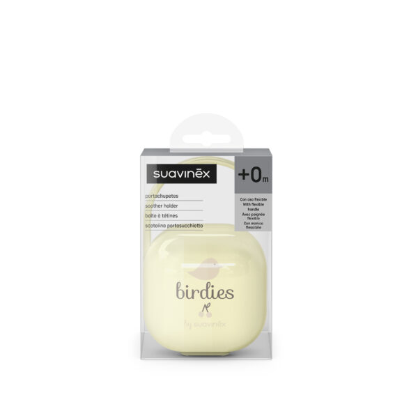 El Portachupete Prints «Birdies» de Suavinex es el estuche guarda-chupetes esencial para los papás de bebés desde el nacimiento (0m+). Fabricado en polipropileno (PP) libre de BPA, está diseñado para guardar, proteger y transportar los chupetes de forma limpia e higiénica dentro de la pañalera, el bolso o el cochecito. La colección «Birdies» incluye motivos de pájaros y naturaleza en tonos pastel, disponible en varios colores: beige, rosa, verde y amarillo, a juego con el resto de la línea.