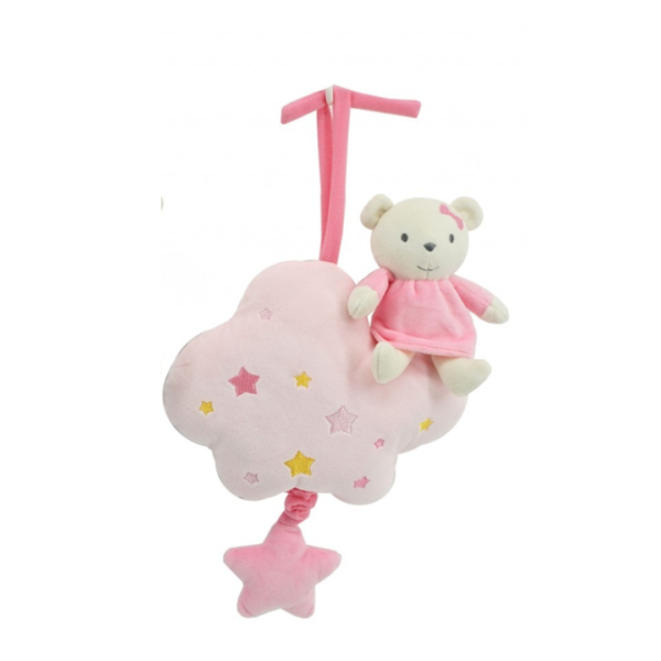 Woody Toys Cunero 110412 es un juguete de cuna y cochecito con diseño de nube y osito de peluche en tonos rosa y celeste. Está confeccionado en tela tipo plush muy suave al tacto, con bordados de estrellitas de colores que le dan un aspecto tierno y decorativo ideal para el espacio de descanso del bebé.