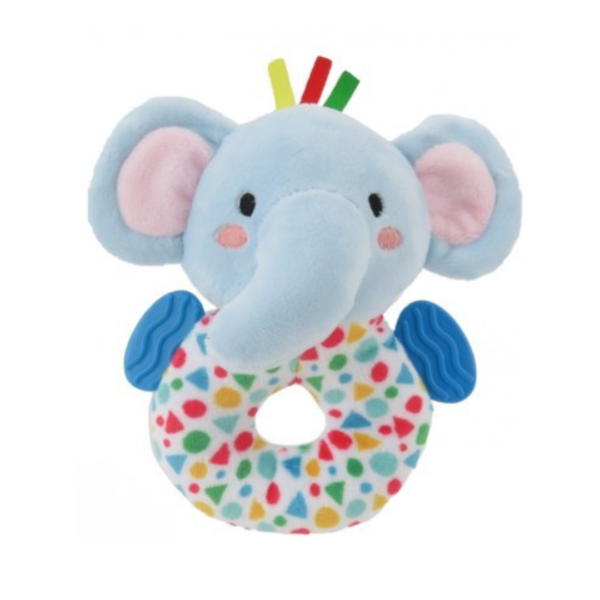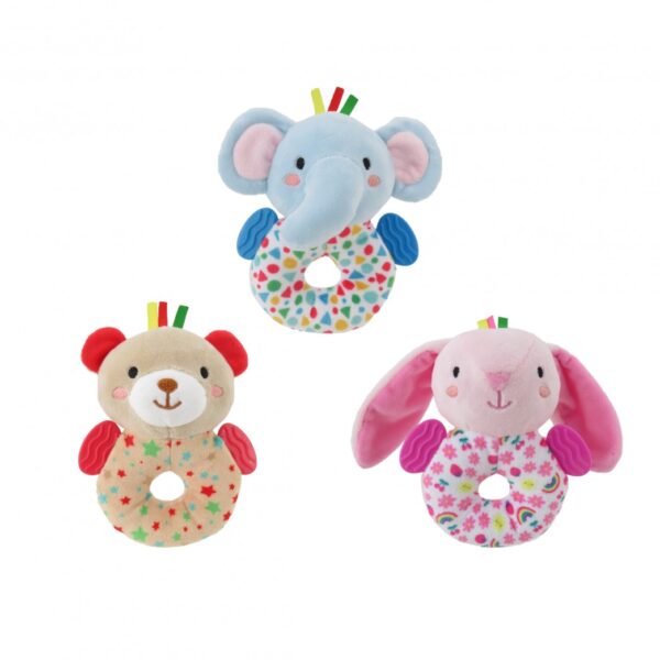 Sonajero de 6 pulgadas con cuerpo de aro soft para agarre fácil, personajes surtidos (oso, conejo, elefante) y laterales texturados tipo mordillo; ideal desde +3 meses.