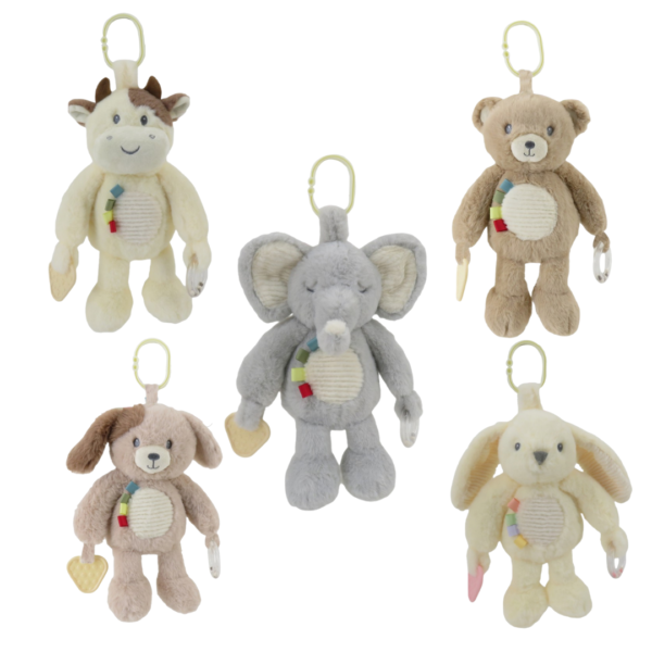Woody Toys Sonajero 341113 es un peluche colgante suave con forma de animal (osito, elefante, perrito, conejo o vaquita) pensado para acompañar al bebé desde recién nacido. Cada muñeco tiene cuerpo de plush extra suave, pancita texturada y detalles de colores suaves, ideal para estimular la vista y el tacto.