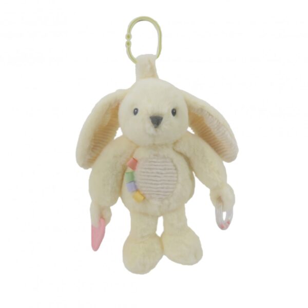 En el interior del peluche hay un sonajero que emite un suave sonido al moverlo. En una mano tiene un mordillo con relieve para que el bebé alivie molestias de encías, y en la otra un aro plástico transparente o similar que también puede manipularse.