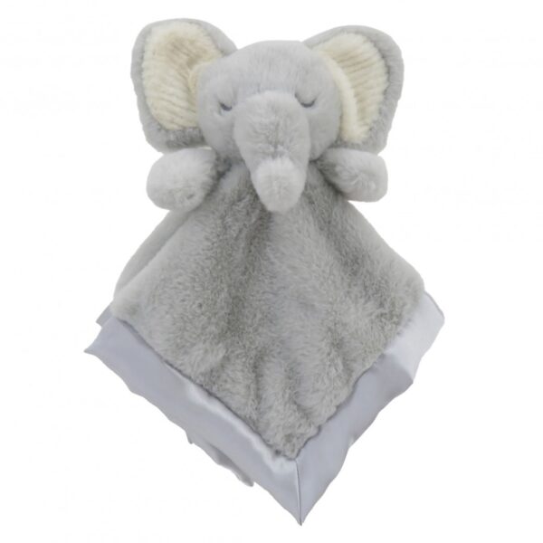 Trapito Elefante Woody Toys Art. 3L006F-14 es una manta de apego diseñada con una estética clásica y elegante. Mide aproximadamente 14 pulgadas (35 cm) y está confeccionado íntegramente en peluche «plush» gris de alta calidad. En el centro presenta la cabeza de un elefante con trompa, colmillos suaves y orejas grandes con un interior de textura tejida en color crema. El cuerpo de la manta está formado por dos capas: una superior de peluche gris suave y un borde ancho de satén/raso gris brillante que recorre todo el perímetro.